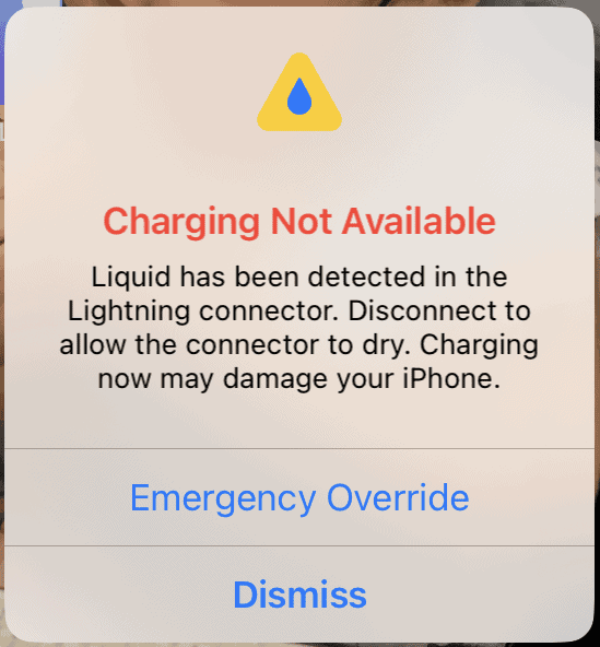 Your iPhone might show this alert after exposure to rain or accidental spills. Even high humidity can sometimes trigger the warning.